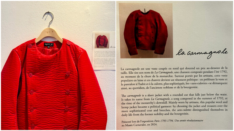 agnès b.2025秋冬系列。 延续对历史的热爱,设计灵感回溯至法国大革命时期的工人服饰。以为名的短版夹克、搭配 sans-culottes 裤型,以鲜红、羊毛、大麻纤维建构出具象徵性的造型语言。它不只是复古,而是一种对阶级与身份的再解释。